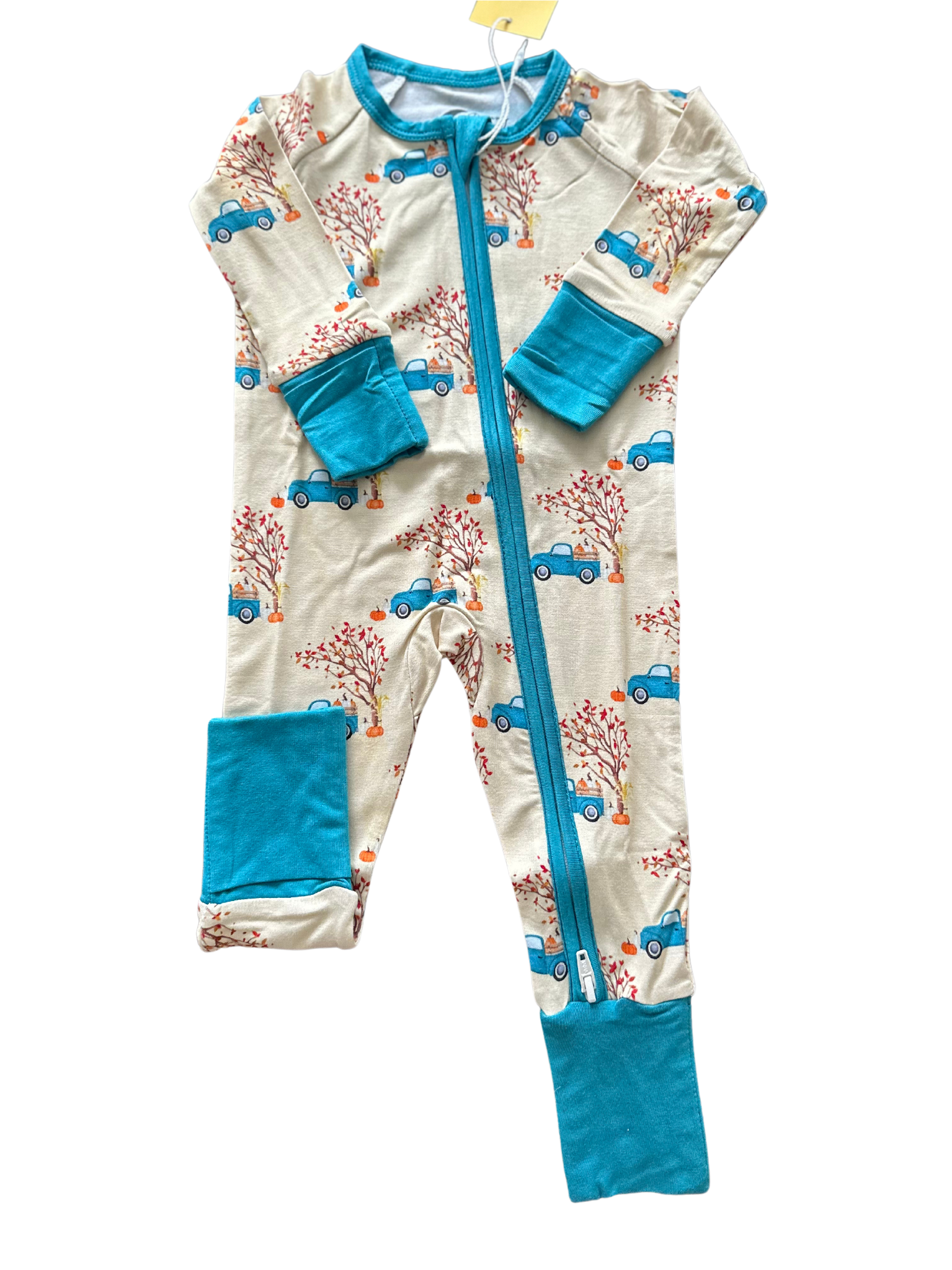 We are obsessed with our bamboo sleepers. The blue truck print is the perfect edition to your child's sleepwear collection. Featuring a double zipper for easy diaper changed, fold over footies making it easy to switch from sleeper to romper. Our fold over function also allows for the sleeper to worn longer as when the child grows simply just let them wear it as a romper.